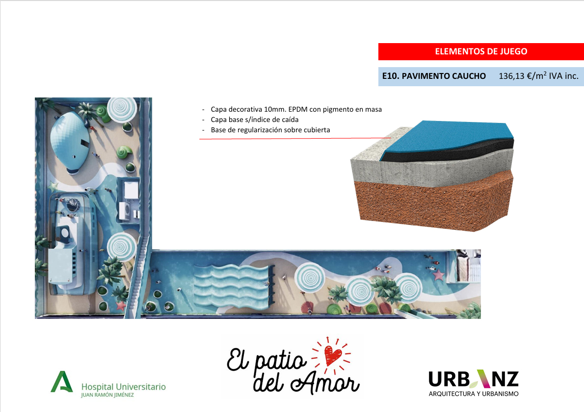 El suelo está compuesto por tres capas, una base de regularización sobre cubierta, una capa base s/índice de caída y finalmente una capa decorativa 10mm. EPDM con pigmento en masa que irá formando nuestra orilla. Este será el elemento predominante de la instalación, no solo por su colorido y volúmenes sino porque será el de mayor extensión.